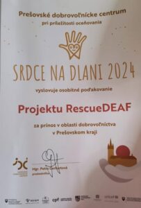 Oceňovanie KRAJSKE SRDCE NA DLANI Prešovského kraja 2024 Prešovské dobrovoľnícke centrum boli sme nominovaní s projektom rescueDEAF